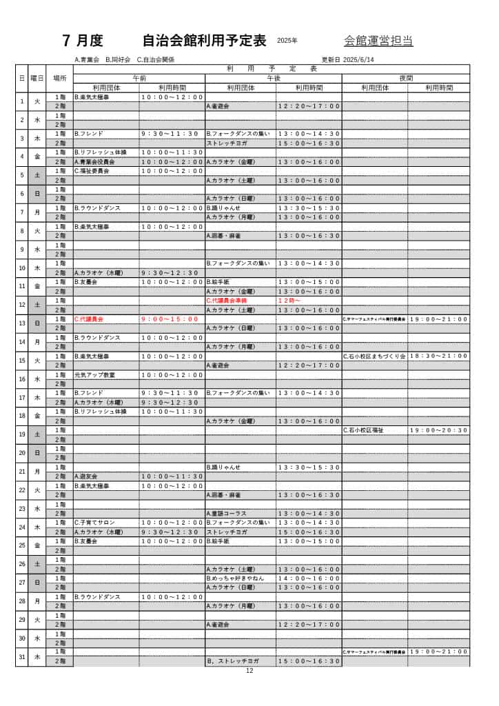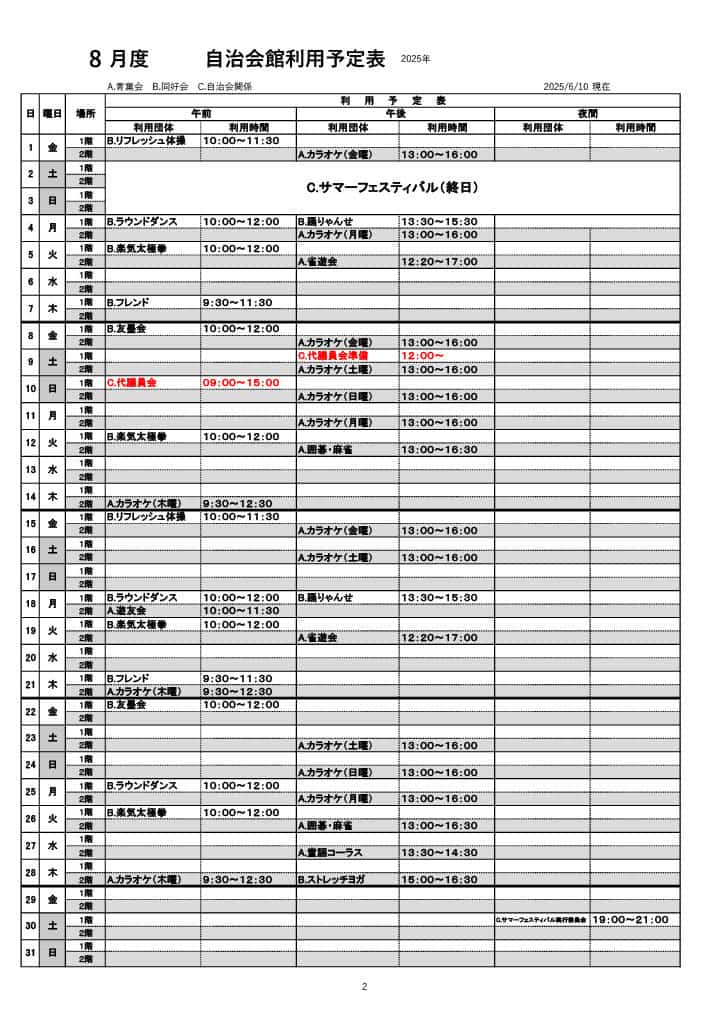 6、7、8月 自治会館利用予定表