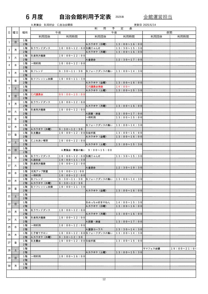 5、6、7月 自治会館利用予定表