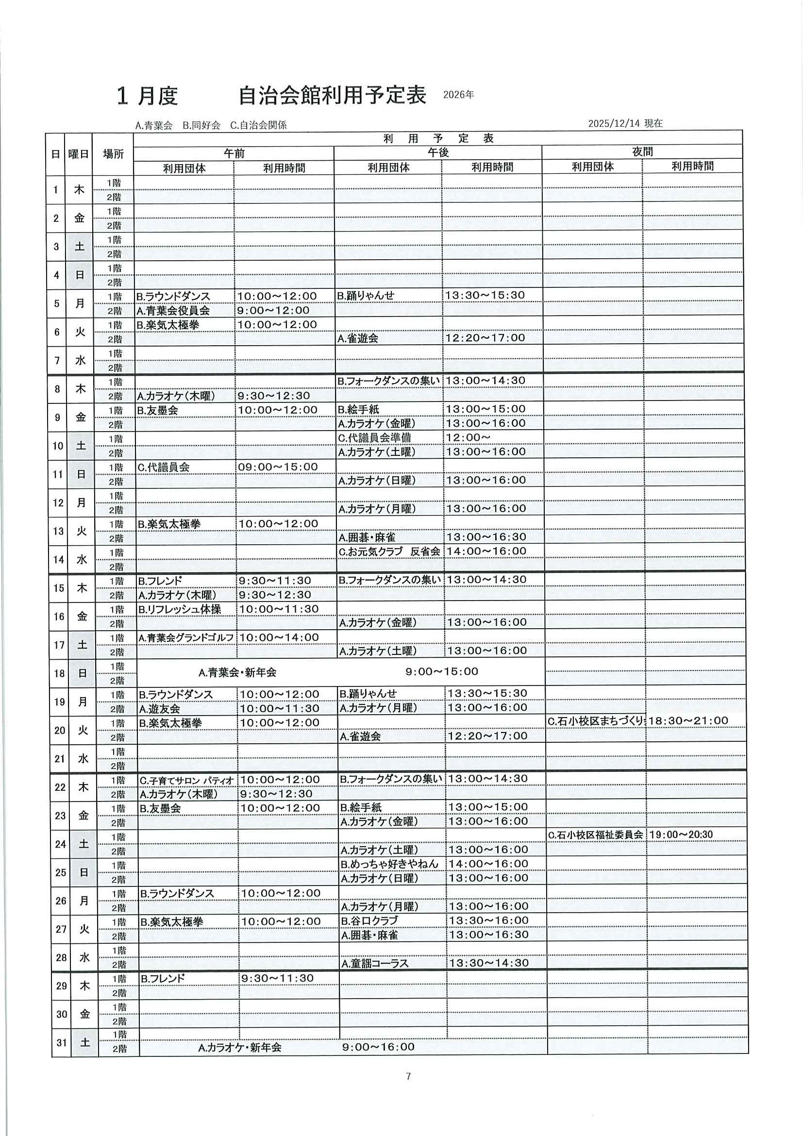 12、1、2月 自治会館利用予定表