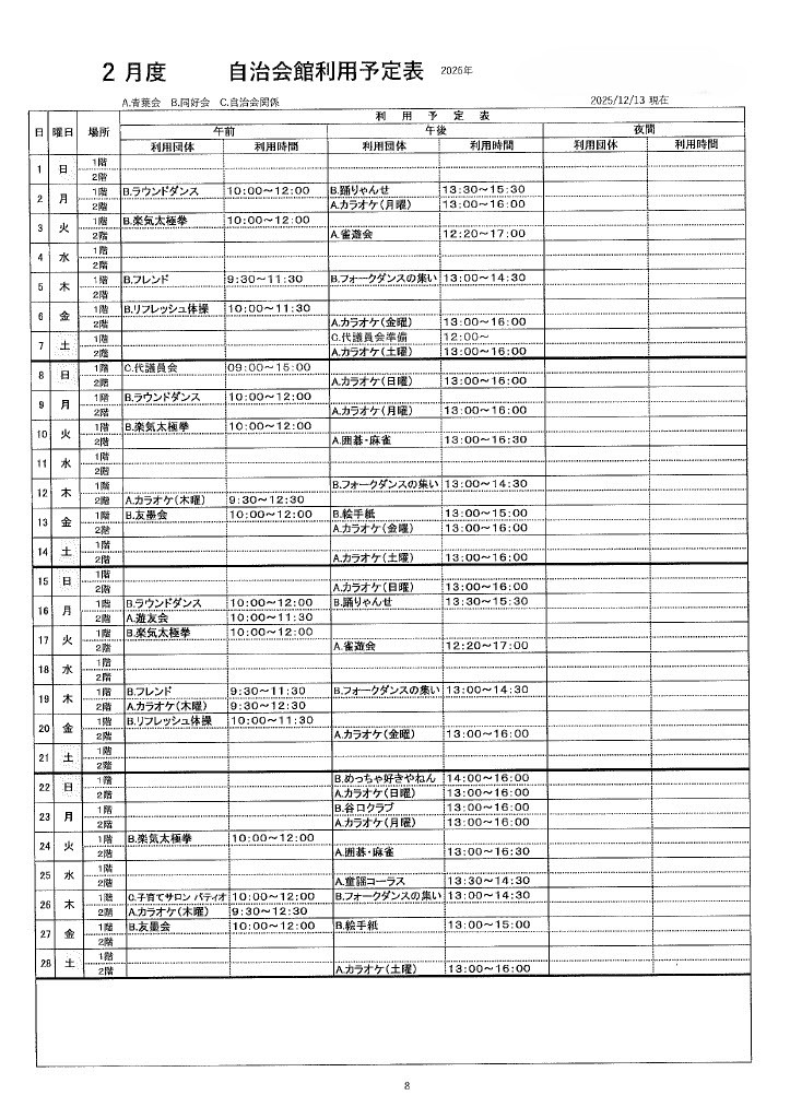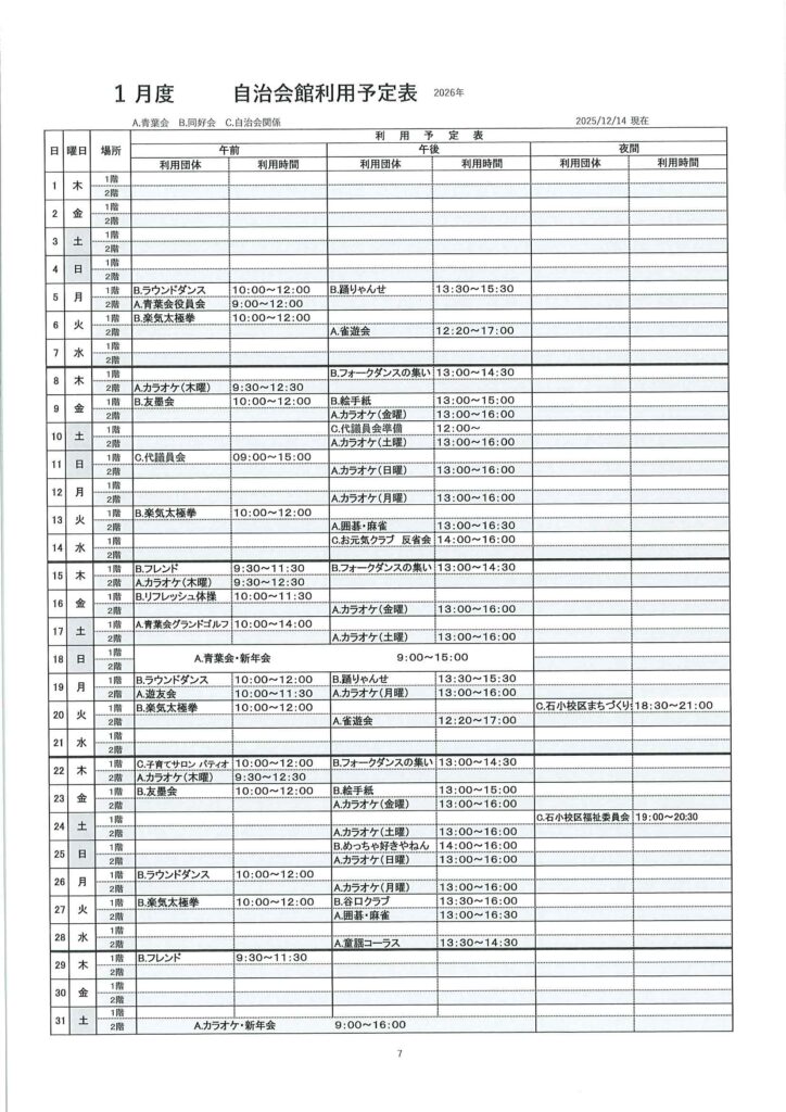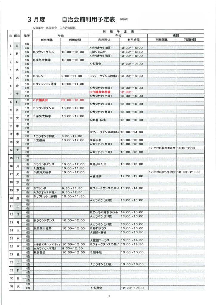 1、2、3月 自治会館利用予定表