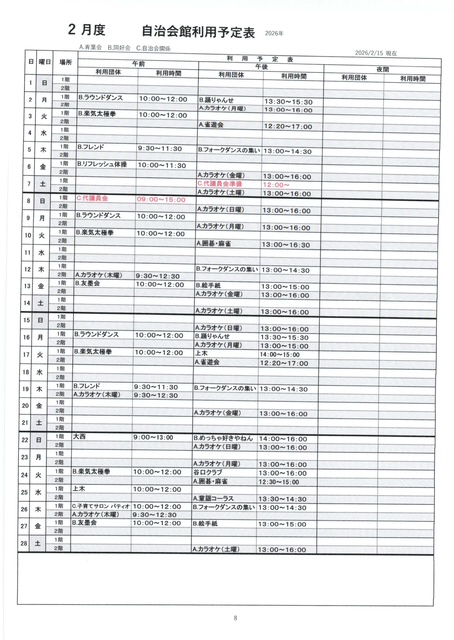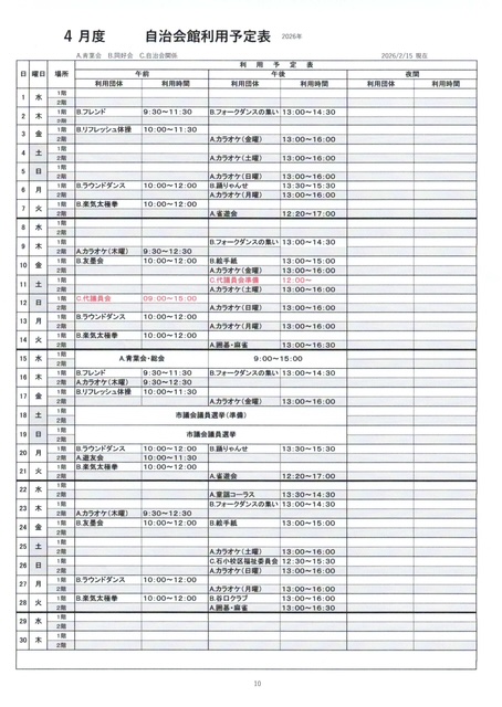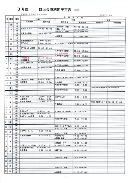 2、3、4月 自治会館利用予定表