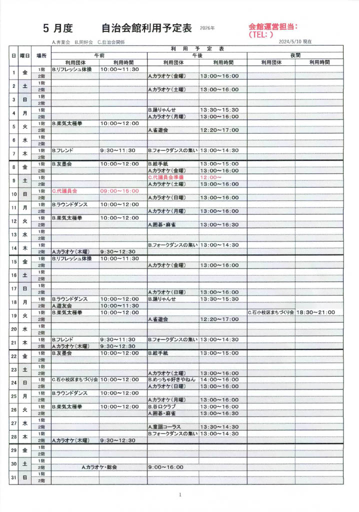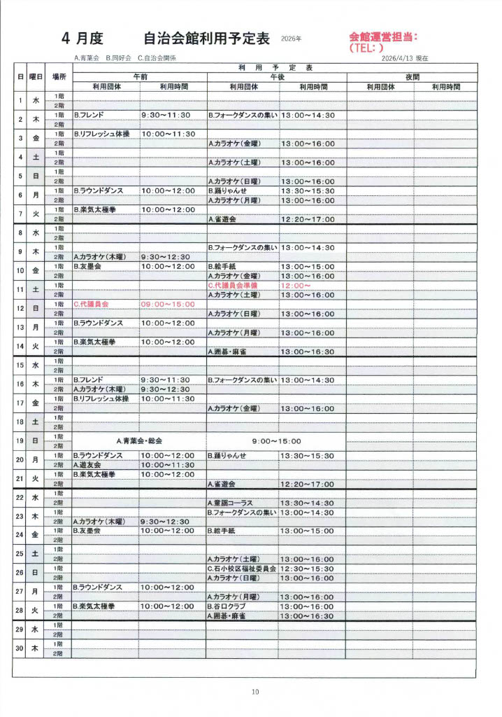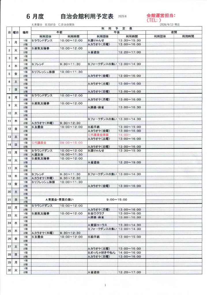 4・5・6月 自治会館利用予定表